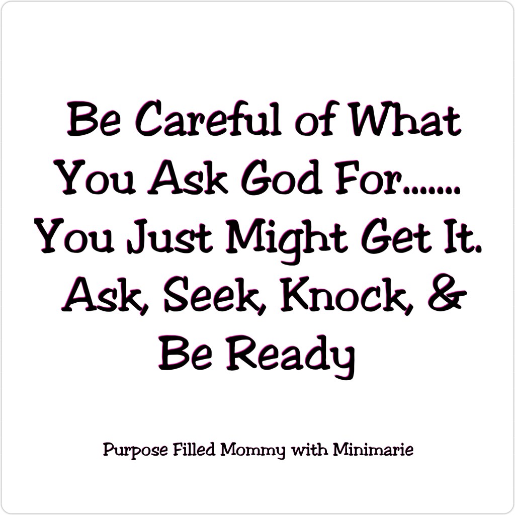 The scripture verse of Matthew 7 :7 tells us how to come to the Lord. It makes it clear that we have permission from God to come to him with what we want without rejection. My mom always says,” Be careful for what you pray for” in letting us know that we must be ready for what we ask for in being able to handle the outcome. I prayed for a stable teaching position, and I recieved it, but I am also responsible for holding my part of the position in getting certain credentials along with following through with the position’s requirements from the school board daily in my classroom. I prayed for a home, and I have a lovely home, yet I’m aware that being a homeowner means taking care of the needed home repairs. If I prayed to be a mother; I know that raising children takes love along with many other responsibilities to ensure the best in my children’s wellbeing as a mother. Many pray for God to send them the love of their life to marry, but there are so many factors that you have to look for within yourself along with the other person to consider in receiving the love of your life in being ready for. We may pray for godly friendships, but we have to make sure our prayers for those godly friendships match our character. If we pray for God to reveal something to us, we can’t sulk when he reveals the answers of what we asked for. We should never hesitate coming to the Lord in prayer, but we should also be ready for when he answers.